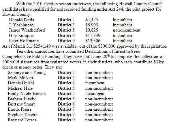 To follow the list of those qualifying for funding, go to the state spending commission website at hawaii.gov/campaign/comprehensive/candidates-receiving-comprehensive-public- funds-in-the-2010-elections The Honolulu League of Women Voters, in conjunction with State League, has commissioned a study of Act 244 in its first election cycle. The A.L. Burruss Institute of Public Service and Research is conducting the study. Sue Dursin |