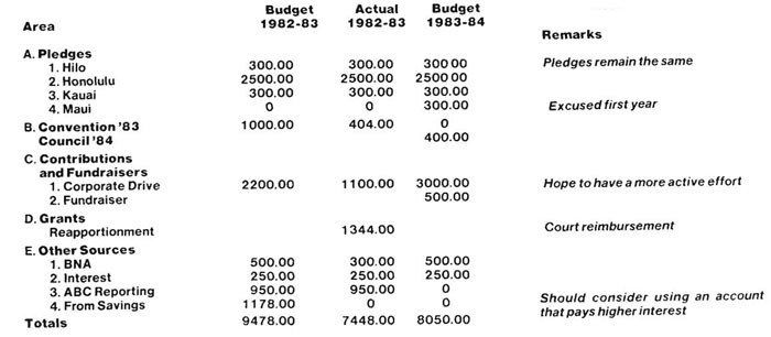 Action! (Marion Saunders) League Testifies at Legislative Hearings Voters Service (Marian Wilkins) Juvenile Justice (Catherine Filson) Around the State Water (Linda Lai Hipp) Legislation on Water (Linda Lai Hipp & Anna Hoover) Energy (Joan Davenport) Reapportionment Update (Anne Lee) State Convention LWV of Hawaii Proposed Budget 1983-84 |