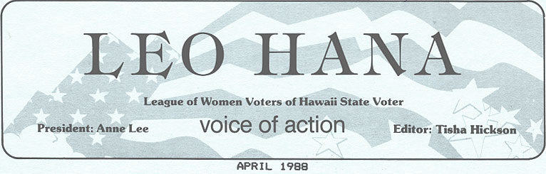 League at the Legislature Results of Consensus on Primary Elections Bicentennial Scripts Available Small Business Hawaii Joins Forces with LWV/Hawaii in Vacancy Study Debates Conference Held (Sheila Gilbertson) From the President (Anne Lee) Action on Education (Libby Oshiyama & Marion Saunders) Letts Resigns from Board Agriculture Study Hawai'i County LWV Adopts Positions on Makalawena... (Dorothy Doudna) Special Thanks Council 88 Fundraising Update ABC Reporting |