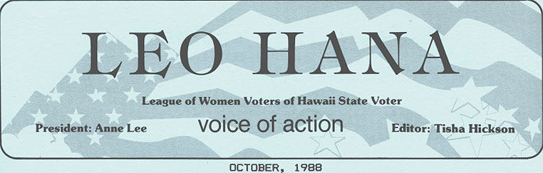League Election Forums in HawaiiState League Natural Resources Chair, Kiyoko Nitz, welcomes active participation in natural resource issues by League members from all islands. Nationally the League has broad positions on Water, Air, Waste Management, Land Use, and Energy. At the state level, the League has also studied and reached positions on natural resources issues of particular concern locally, namely, Land Use, Solid Waste, and Energy. There is lots to be done, such as monitoring local concerns and following bills during the legislative session if your time permits. If you have some time and are interested get in touch with Kiyoko at 1180 Kika Place, Kailua, HI 96734; Ph. 261-7536. Leagues in Hawai'i continue the debate tradition of providing voters with opportunities to see candidates in settings they and their media consultants do not control. League debates and forums have that special quality that exists because we are nonpartisan, neither endorse nor oppose candidates or parties, and have no stake in the election results. - August 31 saw the first in League debates as Democratic candidates for Mayor of Honolulu Marilyn Bornhorst, Randall Iwase, Patsy Mink, and Dennis O'Connor faced the public through KGMB Channel 9 cameras. Moderator was KGMB anchor Bob Jones; panelists were Don Rockwell (KHVH-newsradio 99), Stacy Sakamoto (KGMB) , and Peter Wagner (Star-Bulletin). KHVH radio also broadcast the debate simultaneously. - September 1 saw candidates for state legislature at a forum in the campus center of UH/Hilo with moderator Jan Kido. The forum was put on video by the UH/Hilo media center and replayed by Comtec, Channel 13, on September 12 and 13. - September 7 saw a premiere on the island of Kaua'i as the League debate became the first program ever broadcast live island-wide by Kaua'i Cable TV, Channel 6. Starring in that debate were Democratic mayoral candidates for Kaua'i Tony Kunimura and JoAnn Yukimura, with moderator Don Rockwell from KHVH-newsradio 99. The League enjoyed real community support with STOUFFER'S WAIOHAI HOTEL contributing the facilities for the debate and a room for Rockwell and TROPICAL RENT-A-CAR donating a Cadillac for Rockwell's transportation on Kaua'i . Kaua'i also held its traditional Meet the Candidates night one evening in Lihue before an audience of 150. - September 7 saw a forum for state legislative candidates in Kona. Held at the King Kam Hotel, the event was cosponsored with the Kona-Kohala Chamber of Commerce. - September 8 in Kona, again at the King Kam Hotel and cosponsored by the Chamber of Commerce, a forum focused on candidates for Big Island Mayor and Board of Education.