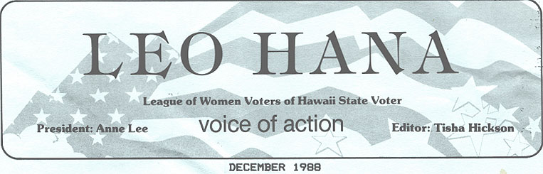 League Looks toward 1989 Legislative SessionWith January and the opening of the legislature close at hand, League members thoughts turn, or return, to legislative action. Last session we saw success in several areas. With regard, to reapportionment, we supported a bill to .amend our state constitution to. bring it into conformity with U.S. constitutional law, which resulted in constitutional amendment #7 on the November ballot. (It lost, but the yes votes outnumbered the no votes on all islands.) With regard to access to government for Neighbor Islanders, we saw passage of a bill that "established a one-year Fair Access Commission to review'' access of Neighbor Islanders' to all government activities and services, with representation on the sevenmember Commission by island rather than county. With regard to land and natural resources, we supported successful legislation enhancing the public right-to know about and participate in the disposition of public lands. This coming year, we will be monitoring the following at the legislature: Natural Resources, Education, Juvenile Justice, Election Laws (particularly regarding a BOE primary), Fair Access by Neighbor Islanders, Human Resources, Constitutional Amendments and Reapportionment, Initiative, and Sunshine, It is too early to know exactly what will be on the agenda for each of these issues. However, we expect some action in education following the recent release of the Berman report, and we will be monitoring how the administration is going to enforce the new public information law that created an Office of Public Information. If you are interested in working in any of the above areas, please call Anne Lee (395-5451 Oahu) or Evelyn Bender (737-2524 Oahu) . The areas of air, waste, and human resources (including child care) are particularly in need of some help.