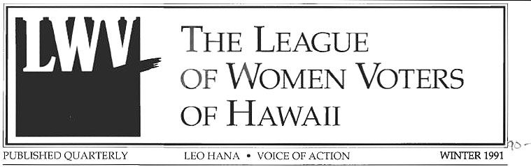 ![]() President's MessageElections are over and we are settling in for a long legislative session. The League's legislative priorities are listed elsewhere in this newsletter. Evelyn Bender has again agreed to be our Legislative Chair. She will coordinate all issues and testimony. As you can see from our list of priorities , we have a full agenda. If you would like to help lobby or are willing to give testimony on behalf of the League, please contact Evelyn. Also, thanks to the hard work of Evelyn acting on behalf of the League, and in cooperation with a strong coalition, the Public Access Room (Rm. #309 on Chamber level) is open during session. If you can volunteer to help in the Access Room, please let Evelyn know. Her number is 737-2524. Thanks to all volunteers who will be taking the League message to the Legislature. The delegates at National Convention last June adopted a two-year Health Care Study. The focus and scope of the study are: 1.) Focus - evaluate public and private mechanisms for delivery of and financing of health care in the United States. and 2.) Scope - examine the current status of and evaluate public and private alternatives for the delivery and financing of health care in the U. S., including coverage, cost, funding, "rationing," strengths and weaknesses. The State League is pleased to welcome as coordinator of the study for the State Earl Fedje, President of Planning Services Hawaii, Inc. Earl has a long history of involvement and expertise in health care planning; he is looking forward to working with the local League Health Care Study chairs. If you would like to join this very important and timely study, please contact the president of your local League. Also adopted at National Convention was a position on gun control. The position states that the proliferation of handguns and semiautomatic assault weapons in the U. S. is a major health and safety threat to its citizens. The League supports strong federal measures to limit the accessibility and regulate the ownership of these weapons by private citizens. The League supports licensing procedures for gun ownership by private citizens to include a waiting period for background check, personal identity verification, gun safety education and annual license renewal. The license fee should be adequate to bear the cost of education and verification. The League supports a ban on "Saturday night specials," slang for cheap handguns that are easy to buy and conceal. The League urges enforcement of strict penalties for improper possession and for crimes committed with handguns and assault weapons, and allocation of resources to better regulate and monitor gun dealers. Plans are well along for the State Convention to be held at the Sheraton Waikiki Hotel on Saturday, May 18 and Sunday, May 19, 1991. Our Convention Cochairs are Irene Coogan and Jerry Hess. We can always use volunteers, so please call Irene at #7371262 and Jerry at #944-8309. The theme is Health Care and an exciting program is planned. Mark your calendar and plan to join the state board and local league delegates. All members are welcome. It will be a terrific convention! Sandra Duckworth |
