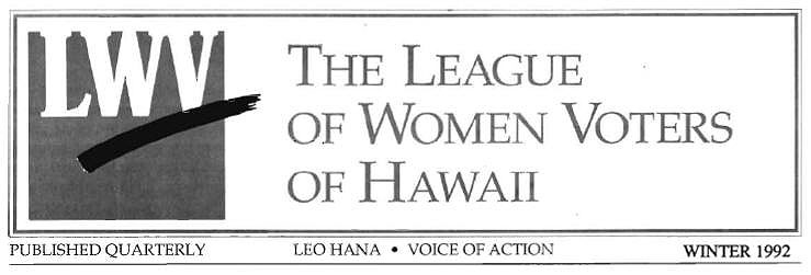 President's MessageThe election season is in full swing and it appears there is going to be a lot of negative campaigning. The League, however, will continue in its endeavors on the local, state, and national level to register voters, urge people to vote, provide information on candidates and issues to the voter, and above all, to try to focus the campaign on issues. We, in Hawaii, must do our share of these tasks. The local leagues are providing their usual voter service activities such as voters guides, candidates forums, etc. The State League, in cooperation with Hawaii Planned Parenthood, Hawaii Civil Liberties Union, and Hawaii Women Lawyers, has compiled a Voters Guide, giving candidates' views on many issues affecting women, which will be available for general distribution. The State League will also publicize the League's position on the proposed constitutional amendments on Board of Education and reapportionment which will appear on the ballot in the primary and general elections. As League members and responsible citizens, we all must continue to emphasize and focus on the importance of a candidates' positions on issues rather that allowing candidates to make minor or irrelevant charges and countercharges. We need to encourage people to register and to vote. We must point out that one vote does make a difference. No election is too minor or unimportant. Each one is important to everyone and the results affect everyone's daily life. Democracy is not a spectator sport. If citizens do not participate, they cannot complain or grumble about the people who are elected and what they do while in office. Keep these four quotations in mind as use them as you try to convince people to vote.