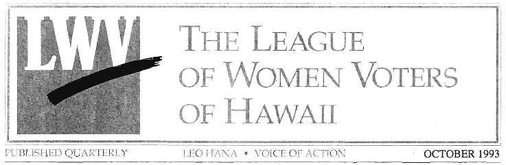 ![]() President's MessageAs I sit down to write my first report as the President of the League of Women Voters of Hawaii, I feel very honored to be in this position of such an honored and respected organization. However, I feel the sense of trepidation with which I accepted this position. To those of you who have put your trust in me, I thank you very much, but immediately, I turn to you and ask you for your support and help. I am very grateful that you elected Board members who are so well qualified and eager to develop an effective program. I am optimistic that we will be able to contribute much to our society. I see that there is much to be done. The magnitude of what should be done or needs to be done is enormous. The question really is: What can we do? What we can accomplish will depend on you, the members. We need your input and help. At this point, among the many issues and problems that we could be involved in, I will highlight education and voter service. Education is fundamental to everything that goes on in our society. Therefore, education must be our number one concern. However, Hawaii's education system is faced with many problems. Help is needed. Since I am dedicated to quality education and community service, Board members have chosen me to be the chair of our Education Committee. Board members Cira DeCastillo, Patricia Card, and Jana Chang have volunteered to serve on the Committee. We welcome all who are interested in education to join us. With election year just ahead of us, we need to plan and get involved. We should help get more people registered to vote; then, we need to help get them out to vote. We need to help voters know their candidates. Please call us with your ideas and help. National Council. As your President, I attended the National Council of the League of Women Voters of the United States which met in Washington, D.C., June 5-8. Other delegates from Hawaii were Arlene Kim Ellis and Marion Saunders. About 200 Leaguers from around the nation and the Virgin Islands attended. Keynote speaker LWVUS President Becky Cain said that the President of the United States cited the League of Women Voters as a fighter for freedom. Secretary of Health and Human Services Donna Shalala spoke to delegates about health care reform, promising more research into women's health problems, universal access to health care, and increased emphasis on prevention. The Council was invited to the Rose Garden, the first White House reception for the League in 12 years. Both the President and Mrs. Clinton spoke warmly of the League's work on the motor voter bill and on health care reform. A day was set aside as the "Day on the Hill" when all the delegates had an opportunity to visit with their senators and representatives. Unfortunately, members of Hawaii's congressional delegation were not available. We visited with their staff and aides, however. I attended many workshops and discussions dealing with various issues of everyday problems associated with operation of the League. They were interesting and helpful. National Council was a wonderful opportunity to meet the national leaders of LWVUS and of the other state Leagues. It was enjoyable and inspiring to talk with others about issues as well as pleasantries. I am very grateful for the opportunity to attend National Council and thank the State Board for the opportunity. On behalf of the whole Board, I express our appreciation to serve and solicit your active support. You may call me at 946-0092. Jim Koshi * Editor's note: Jim serves as Vice Chair of the City's Neighborhood Commission, 1st V.P. of the Ala Wai School PTA, Co-chair of the Ala Wai School SCBM Council, President of the Washington Intermediate School Ohana, 3d. V.P. of McKinley High School's PTSA, Secretary of the Board of the Moiliili Community Center, and member of the Board of the Friends of the Library. We are pleased that League has "captured" his interest and skills. |