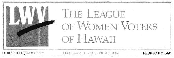 ![]() President's MessageWe thank everyone who has responded to our request for financial support of our League's activities. It is your help that makes it possible to carry out the projects we feel will be for the good of the community and the state. For those of you who forgot, or otherwise have not sent in your support, we hope that you too will help us carry out our programs. With Irene Coogan as our state coordinator for "Citizen's Voice for Citizen's Choice" -- Campaign for a Public Voice on Health care Reform, we are in the preliminary planning stage for the citizen's forum. At the forum we will review various proposals being considered in the U.S. Senate and House. We will be looking at how the proposals will affect Hawai'i's health system. The forum will be held at the Mabel Smyth Auditorium on Saturday, April 9, 1994. Please be there to support this effort to educate the public on the government's efforts to reform the nation's health care system. During the legislative session there will be hundreds of bills considered. If there is any issue you want to follow, and you need to see the bills, we will be getting all the bills, so please make use of them. If you want to testify on a bill(s) or issue(s), please call us. Patricia Card has been following the activities of the Campaign Spending Commission, an area that has created much interest and many questions. Education and gun control are other areas we are following closely. Election year is once, again upon us. There are many, many thoughts about politics in the media. There seems to be much dissatisfaction. Are the citizens ready to register to vote and then vote to make the changes they say are needed? How should we be involved? Can we make a difference? Please call us if you have an idea. Call us if you can help. Again we thank you very much for all the support you have given. Please call us if you have any thoughts on what we should be considering. We wish that this year will be a happy and prosperous one for you. Aloha. Jim Koshi |