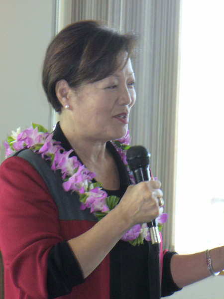 outgoing State President Sue Irvine (incoming VP), U.S. Rep. Mazie Hirono, incoming State President Jacqueline Parnell - [enlarge]