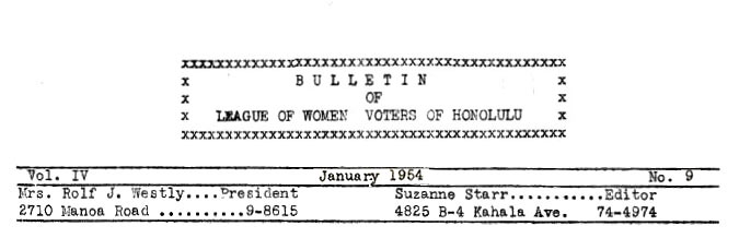 Calendar of EventsJanuary 20 General Membership Meeting, Panel Discussion-"Is Rehabilitation Possible in Jails?" Mr. Jambor, Judge Corbett, Mr. Boling. 7:30 P.M., Y.W.C.A. January 21 Nat. Resource Com. Meeting, 1635B Keller Rd., 8 P.M. January 26 Unit Meetings Group Meeting to attend Bd. of Supervisors, 1:30 P.M. YW. January 27 Unit Meeting January 28 Unit Meeting - Kailua Jail Committee, 7:00 P.M. 2428 Ferdinand Ave. January 29 Voters Service Committee Meeting, 12 noon, YWCA Unit Meeting February 2 Executive Board Meeting 7:30 P.M., 2710 Manoa Rd. Group Meeting to attend Bd. of Supervisors, 1:30 P.M., YW. February 11 Jail Committee Meeting, 7:00 P.M., 2428 Ferdinand