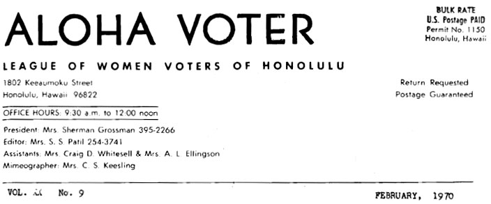 Taxation without Representation (cont.)In the January issue of the Aloha Voter LWV members learned of the proposed two-day campaign to be held in April to secure signatures on petitions asking for Congressional representation for D.C. residents as part of the League's "Year of the Voter." In order that all local Leaguers may be as well informed as possible on the matter the Board authorized the distribution of the enclosed Facts & Issues "The Nation's Capital 'A Nice Place to Visit --But" to all members. This publication provides valuable background information on the history and somewhat checkered career of the District and makes valid comparisons between the District and other states. This Facts & Issues, part of your subscription service, is a "must read" before the April campaign for signatures.