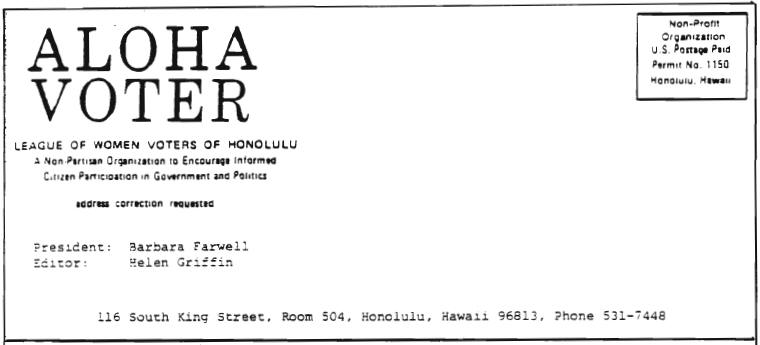 On Juvenile JusticeLeague has been invited to participate in THE GOVERNOR'S CONFERENCE ON JUVENILE JUSTICE on July 30 - 31. Two major topics will be discussed by the approximately 65 participants: Detention of status offenders prior to adjudication and truancy, violence and vandalism in Hawaii's public schools. The Conference will make recommendations to the Governor for legislation and/or administrative implementation. LWV will be represented by MARJORIE KALILIKANE and NAN LUTER.
