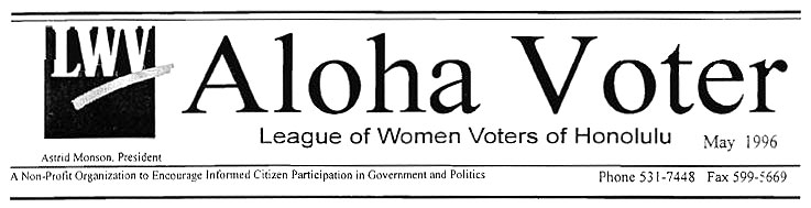 Consensus on Con ConHonolulu League reached consensus to oppose a Constitutional Convention for 1998. The "question" on whether a Con Con should be held in ' 98 will be on the ballot for a referendum in November of this year. As one of the items on the agenda at Honolulu League's Annual Meeting, members spent about an hour discussing the issue. The consensus was that many of the issues being raised in public as worthy of a Con Con could either be addressed statutorily, or with public pressure, considered by the Legislature for constitutional amendments. On an issue like single-member versus multiple representative districts, the authority to designate single or multiple districts (up to 4-member districts) already exists with the Apportionment Commission which meets every 10 years after the national population census. If the public Sees merit in multiple representative districts, it can raise that issue then. The fear was expressed by several members of the highly emotional nature of some of the more visible issues, and member expressed concern that, as in the same-sex marriage debate before the Legislature this past session, there could be intrusion by national groups interested in influencing the local conventions on certain issues. Much of the discussion mirrored the observations offered as reasons for or against having a Con Con as contained in the committee report mailed to all League members statewide with the Aloha Voter. Many felt that while there were some valid arguments for having a Con Con, the negatives outweighed the possible good that could come from a convention, and, with the added burden of the great cost of a convention when the State is having difficulty funding many worthwhile programs, we should be looking for alternatives to address those issues that some feel need review. Many felt that the energy and time needed to prepare for and hold a successful convention could be expanded towards solving these problems without a formal convention. There was a question raised as to whether League should even take a position on the "question." and whether State League had a position on State Government an/or the constitution that would permit our taking a position. State League's position on the State Constitution lists some provisions that should be included in our Constitution. One of these is that the Constitution should provide for amendment, review, and revision. Does this provision give League the responsibility of entering the public debate on when and how the constitution should be amended? Many of us think so. As one member put it, the public is going to look at the League to take a position on this. There was some opposition to taking a position on Kauai, so two questions were posed there: 1 } Should League support a Con Con or oppose one? (7% of those attending the meeting supported a Con Con, 93% opposed) and 2} Should the League support a Con Con, oppose a Con Con, or not take a position but possibly educate voters on the pros and cons. (There ,vas no one in support of a Con Con, 46% felt we should oppose a Con Con, and 54% felt that we should take no position and stick to the education of voters.) At Honolulu meeting, there was some discussion on possible follow up activities after State action on the League position on the "question." There was a general feeling that in pushing for a "no" vote on the question, we should list the more prominent pros and cons and give our reasons for rejecting a Con Con at this time. Honolulu League will present our views and the question raised to State Council where the final decisions will be made. We have received some favorable comments on the Con Con Committee Report distributed to all League members statewide with the April Aloha Voter. (It really should have been mailed as an insert to the Leo Hana, but because of the necessity to distribute it before the locals Annual Meetings, it was sent out with the Aloha Voter.) We would like to recognize the efforts of the members of the Con Con Committee who managed to fit in the many interviews into their busy schedules and the sub-committee chairs who helped shape and guide the project and the final report. A special thanks to Suzanne who spent a stressful few days on the computer typing the pages as they were faxed to her, faxing the completed pages back to the office for editing and changes, making the changes even as she typed more pages as they were faxed to her. A special thanks also to Arlene who coaxed and stroked our over-worked copier into producing the thousands of pages in record time (she even spent Sunday of that week at the office) so that the report and the Aloha Voter could be collated and readied for bulk mailing by Monday afternoon. And of course, we would never have met our deadline if it hadn't been for Annie Kim's willingness to drop her own work to help wherever needed. Jean Aoki |
