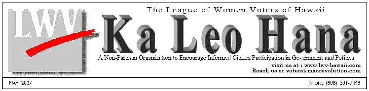 President's Message Convention (Mary Anne Raywid) Con Con 2010 - Yes or No? (Jean Aoki) Newly-Elected 2007 State Board (JoAnn Maruoka) Traveler's Alert (Grace Furukawa) Fundraiser Proposal for League (Suzanne Meisenzahl) Elections News (Jean Aoki) Hawaii Coalition Against Legalized Gambling (Grace Furukawa & Judy Rantala) Contributors to Our 2007 Non-Event At the Legislature (Jean Aoki & JoAnn Maruoka) Vetoes and Veto Overrides (Jean Aoki, JoAnn Maruoka & Jackie Parnell) Design a Non-Event Fundraiser! Chapter Reports - Hawaii (Leilani Bronson-Crelly & Sue Dursin) Chapter Reports - Honolulu (Piilani Kaopuiki) Chapter Reports - Kauai (Carol Bain) |