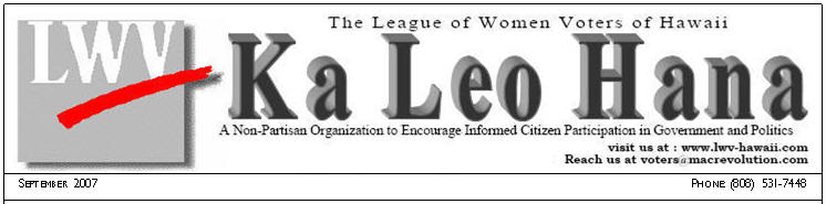 Con Con Study Committee ReportsThe members of the League Con Con Study Committee are almost ready to begin their interviewing of knowledgeable people -- elected officials, agency heads, scholars, community leaders, leaders of non-profit organizations, public and private unions, and others to gather opinions on whether a constitutional convention should be convened Our aim is to talk with as many people as we can, from as many backgrounds as possible to get an accurate picture of the felt need for a revision of our constitution, and also of the pent up desires of our citizenry for a wholesale review of our constitution We have a good group working to finalize our plans and start the interviewing process. We need one more meeting to accommodate the people who could not make it to our last meeting held August 31, because some substantive changes were suggested and we had a good exchange on how to keep our interviews as objective as possible and avoid leading even to the perception of having been skewed to bring about certain results. By the time you read this, we will most probably be in that action phase We really could use more of our members participating in some way on this project. It could be as a member of some interview team, or doing clerical work -- filing things, helping copy reports, compiling and stapling, labeling binders, or typing addresses onto envelopes, readying reports for mailing to our members. If you have even a half day per week that you can dedicate to helping us, please call the office. For members of our neighbor island Leagues, please call your League presidents if you can spend some time interviewing members of your community. By the time this issue of the Ka Leo Hana reaches you, they will be fully informed on our interview guidelines. . We really need to hear from our neighbor islanders to get the complete picture. The timeline for our study group is as follows End of January 2008 - All questionnaires should be in February First two weeks - Working group to compile the survey questionnaires and then prepare that part of the whole committee report addressing the survey results. March - The committee report, "Facts and & Issues on Proposed Con Con" should be distributed to all members by the middle of March. April - Local League consensus meetings. May - State Council and Board Meeting. Decision on position on Con Con. June - If we take a position pro or con, position paper to be written. Plan for wide distribution of paper, plan for advocacy, Ed Fund to plan for education of the public on the pros and cons separate from the work of the advocacy group. July thru October - Implement Action Plans Jean Aoki |